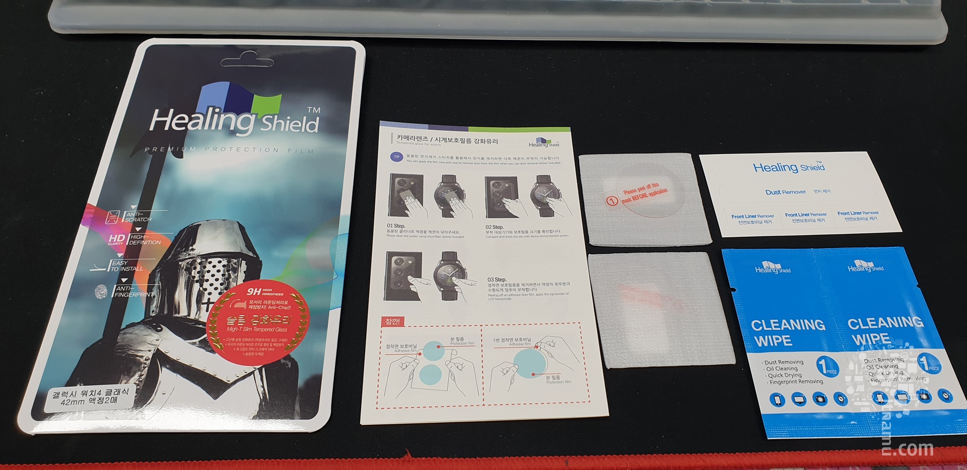 힐링쉴드 액정보호필름은 사용설명서 및 구성품도 잘 갖추고 있는데, 부착에 필요한 강화유리 본품은 물론