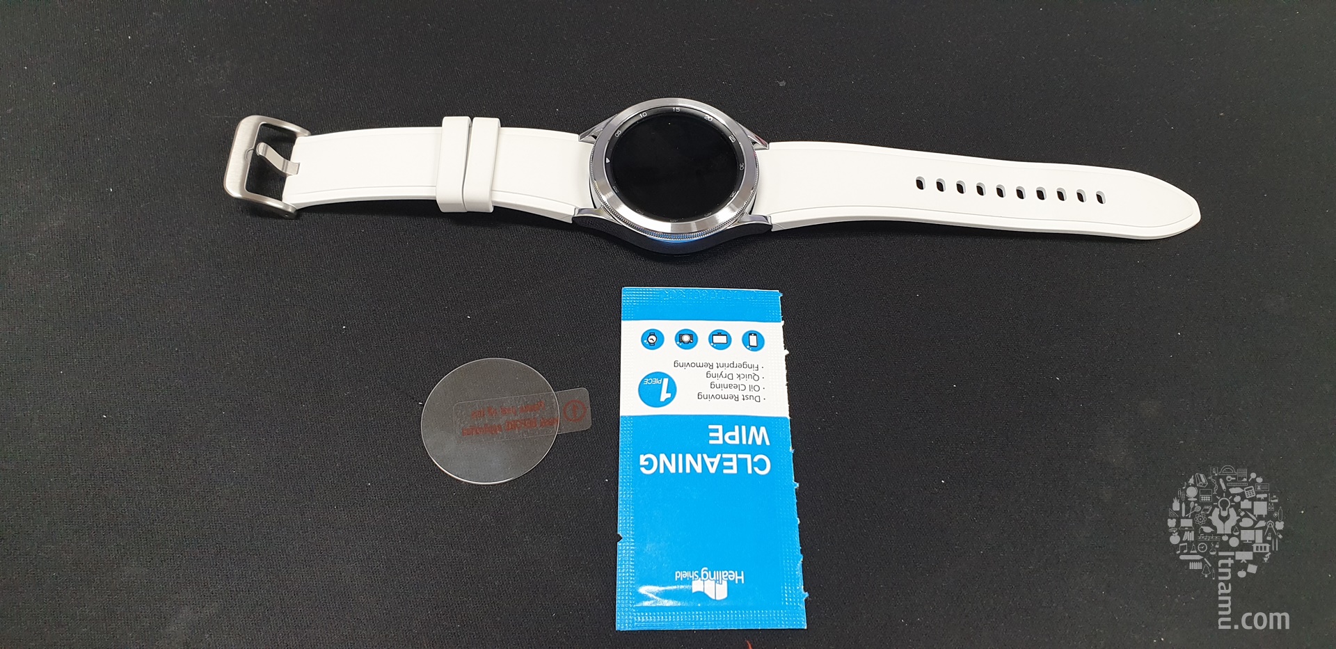 필자가 사용하고 있는 워치4 클래식 46mm와 마찬가지로 힐링쉴드 액정보호필름을 부착했다.